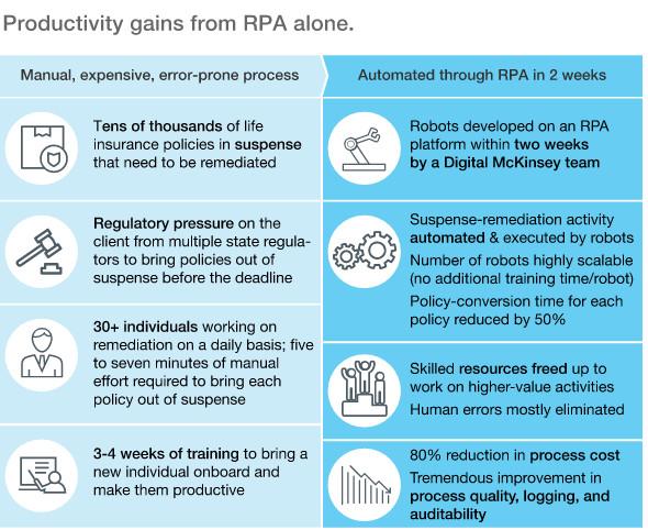 左列:人工完成,昂貴,易錯。數(shù)以萬計的人身保險等待處理,deadline前的管理壓力,30余位員工處理日常工作,每個員工需要3-4周的培訓(xùn)。右列:兩周時間搭建RPA平臺,待解決的工作被機(jī)器人自動執(zhí)行,熟練的人力資源被應(yīng)用在高價值的工作中,人為失誤減少,處理成本降低80%,并極大的提高了質(zhì)量。 一家大型金融機(jī)構(gòu)大規(guī)模RPA轉(zhuǎn)型,自動完成60%-70%的記錄和報告的工作,達(dá)成了30%或更高的年運行率效率。使用相同的方法,另一個機(jī)構(gòu)在額外排隊過程中實現(xiàn)了80%的處理成本減少。FT500中的另一家金融機(jī)構(gòu),使用機(jī)器人技術(shù),每年降低了1.75億英鎊的成本,并節(jié)省了120多FTE。